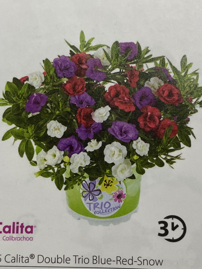 Minipetunie plnokvětá – Calibrachoa Trio: Blue-Red-Snow 42-45 Kč za květináč = 3 rostliny - sazenice v jednom květináči